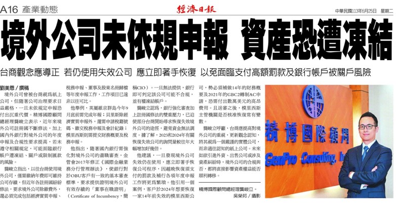 境外公司曾被台商視為紙上公司,但隨著公司治理要求日益嚴格,一旦未依規定申報恐付出沉重代價。精博國際顧問總經理龔峻立表示,近年來境外公司註冊國不斷修法,加上國內外銀行對境外公司的年度申報及合規性要求提高,若未遵守相關規定,可能面臨銀行帳戶遭凍結、關戶或限制匯款的風險。 龔峻立指出,以往台商使用境外公司,僅需繳納年費即可維持公司存續,但近年各註冊國紛紛修法,要求境外公司除繳費外,還必須完成包括經濟實質申報、稅務申報、董事及股東名冊歸檔等年度申報工作,工作項目已遠非以往可比。 他舉例,英屬維京群島今年9月底前需完成年報;貝里斯除經濟實質申報外,還需申請稅籍號碼、繳交稅務申報及會計紀錄;模里西斯則需提交財務概要及稅務申報。 他指出,隨著國內銀行需強化對境外公司的盡職審查,金管會2017年修正《國際金融業務分行管理辦法》,使銀行對於OBU客戶有一致的基本審查標準,要求提供證明境外公司有效存續的「董事在職證明」(Certificate of Incumbency,簡稱CIO)。一旦無法提供,銀行即可判定該公司可能不合規,並有權凍結帳戶。 龔峻立認為,銀行強化審查加上註冊國修法的雙重壓力,已迫使部分台商開始尋求恢復失效境外公司的途徑,避免資金無法調度。據了解,2023和2024年有關恢復失效公司的詢問量較往年大幅增加好幾倍。 他建議,一旦發現境外公司失效仍在使用,應立即著手恢復公司程序,因越晚恢復須支付的罰款及補行各項年度申報工作將更為繁瑣。他引用一個案例,客戶於2024年想要恢復一家14年前失效的模里西斯公司,勢必須補做14年的財務概要及2021年的GBC2轉制AC申請,恐需付出數萬美元的高昂費用。且送審之後,模里西斯主管機關是否核准恢復常有變數。 龔峻立呼籲,台商應提高對境外公司的重視,更新觀念認知,將其視為一個嚴謹的實體公司,而非過往認知的紙上公司。未來如欲引進外資、出售公司或涉及資產糾紛時,境外公司的合規與否,都將直接影響資產權益能否順利轉移。